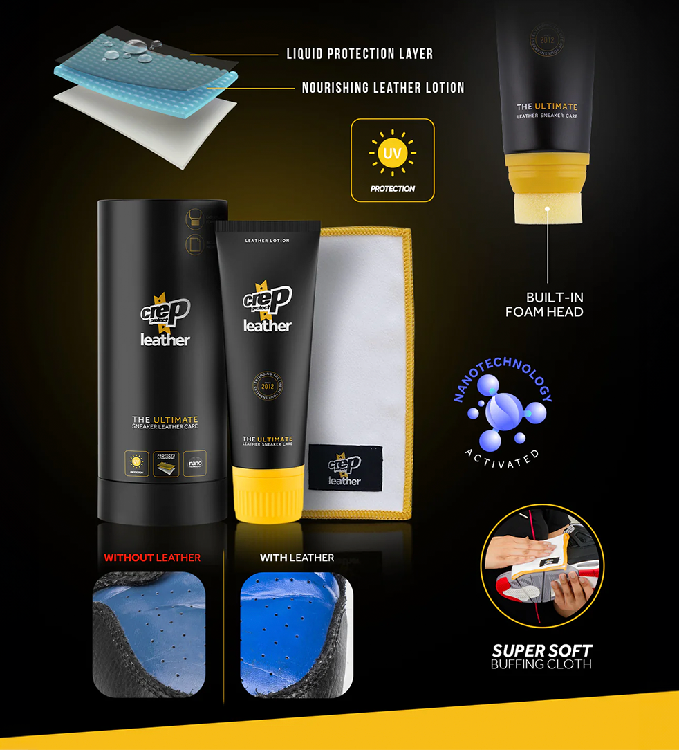 Crep Protect Leather Lotion stands out due to its nourishing formula that rejuvenates and restores leather sneakers and incorporates advanced nanotechnology to repel water, liquids, and stains.