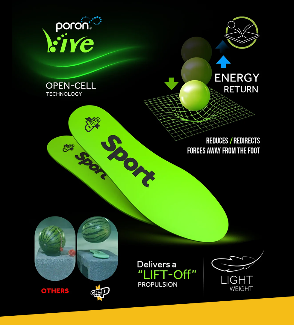 Sport – with Poron vive technology to redirect force away from the foot. For powerful push-offs and quick movements.